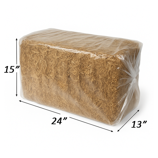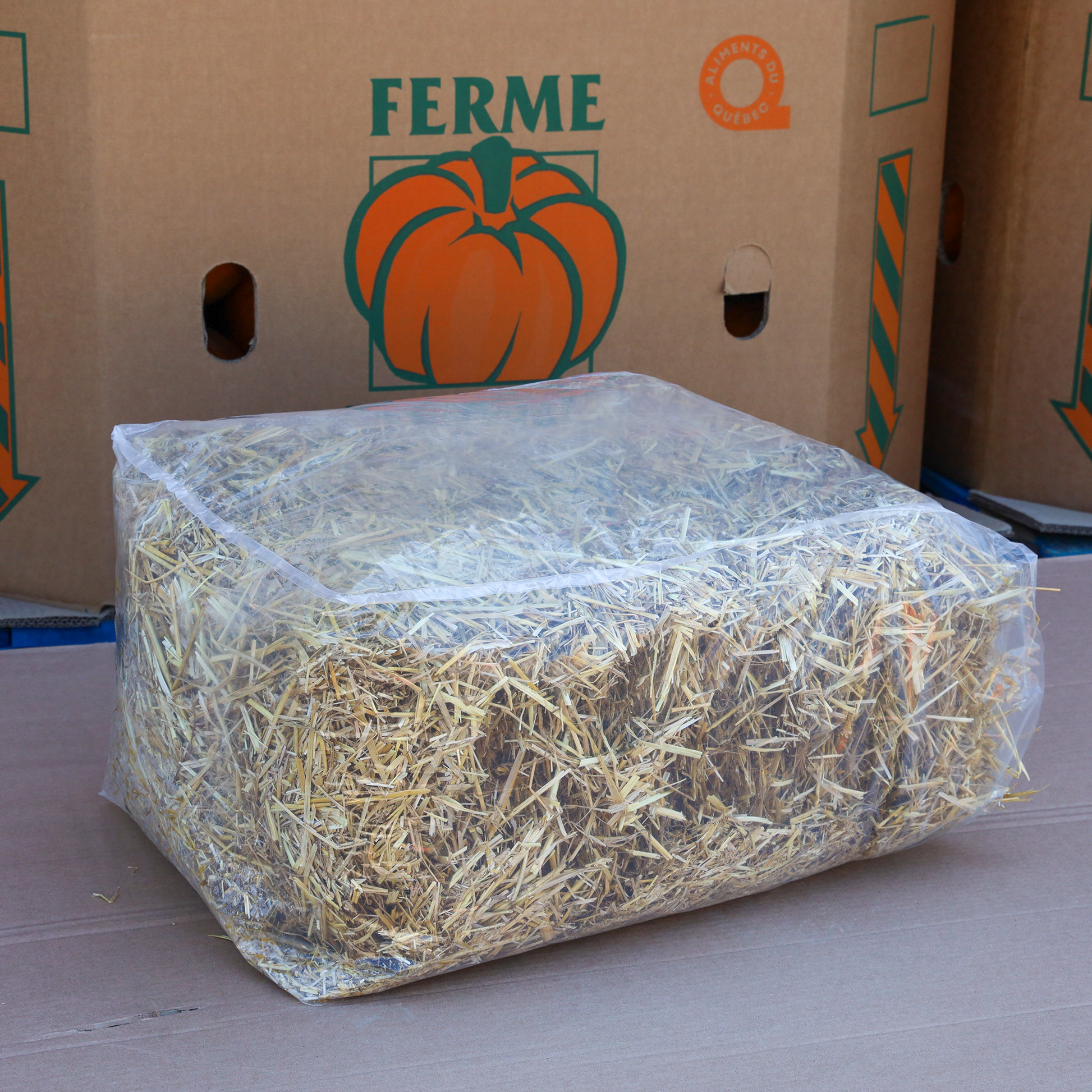 La paille est protégée dans un sac de plastique – moins de dégâts, reste sèche plus longtemps.